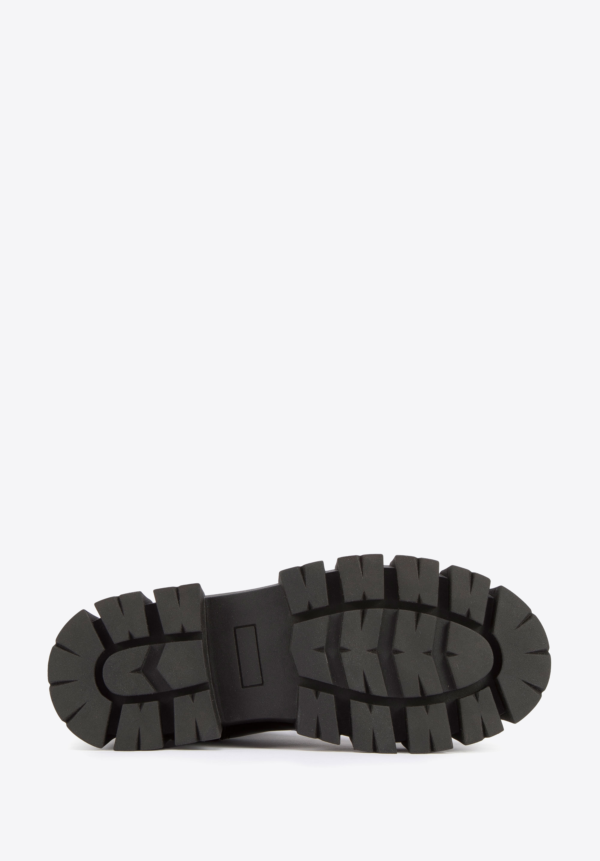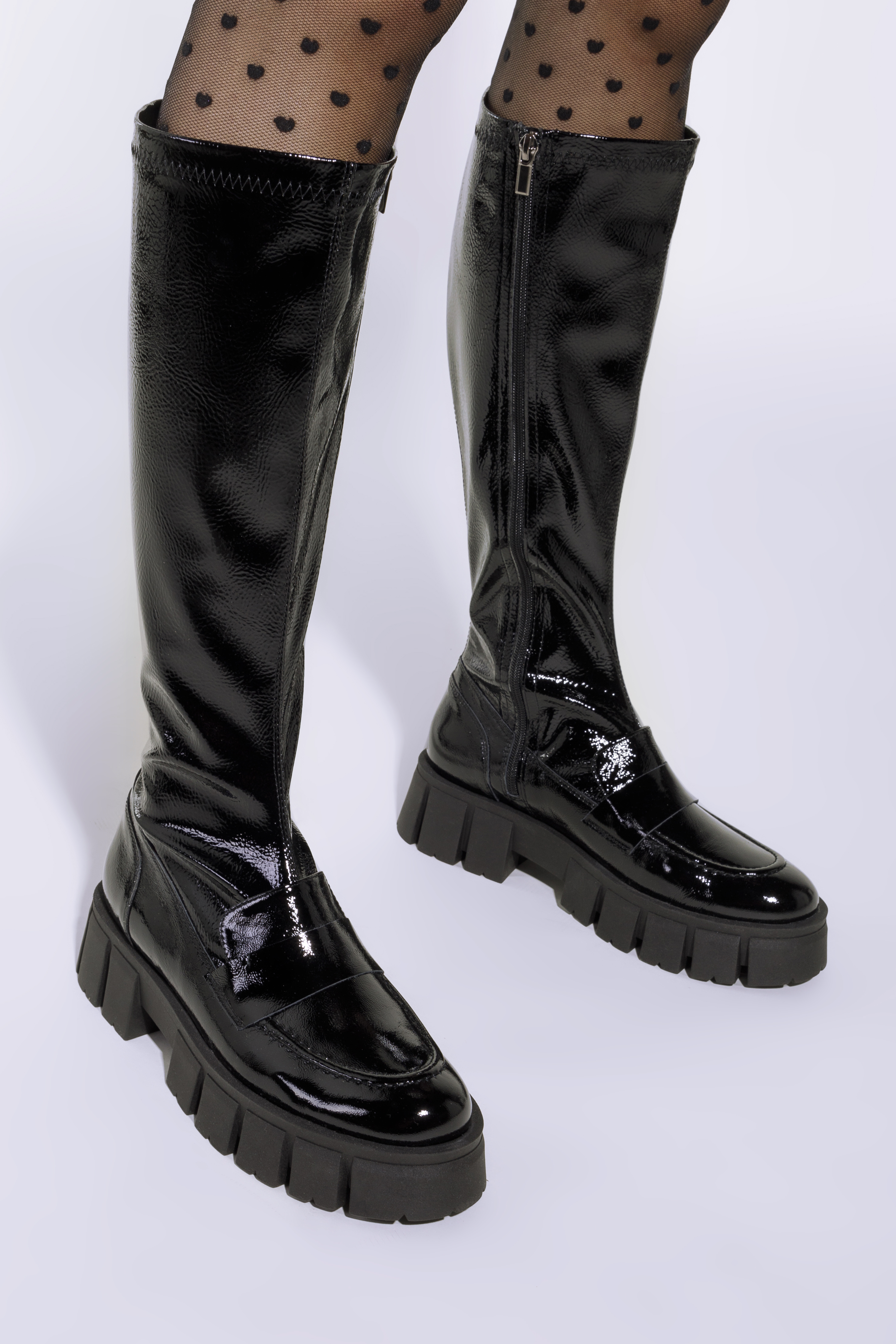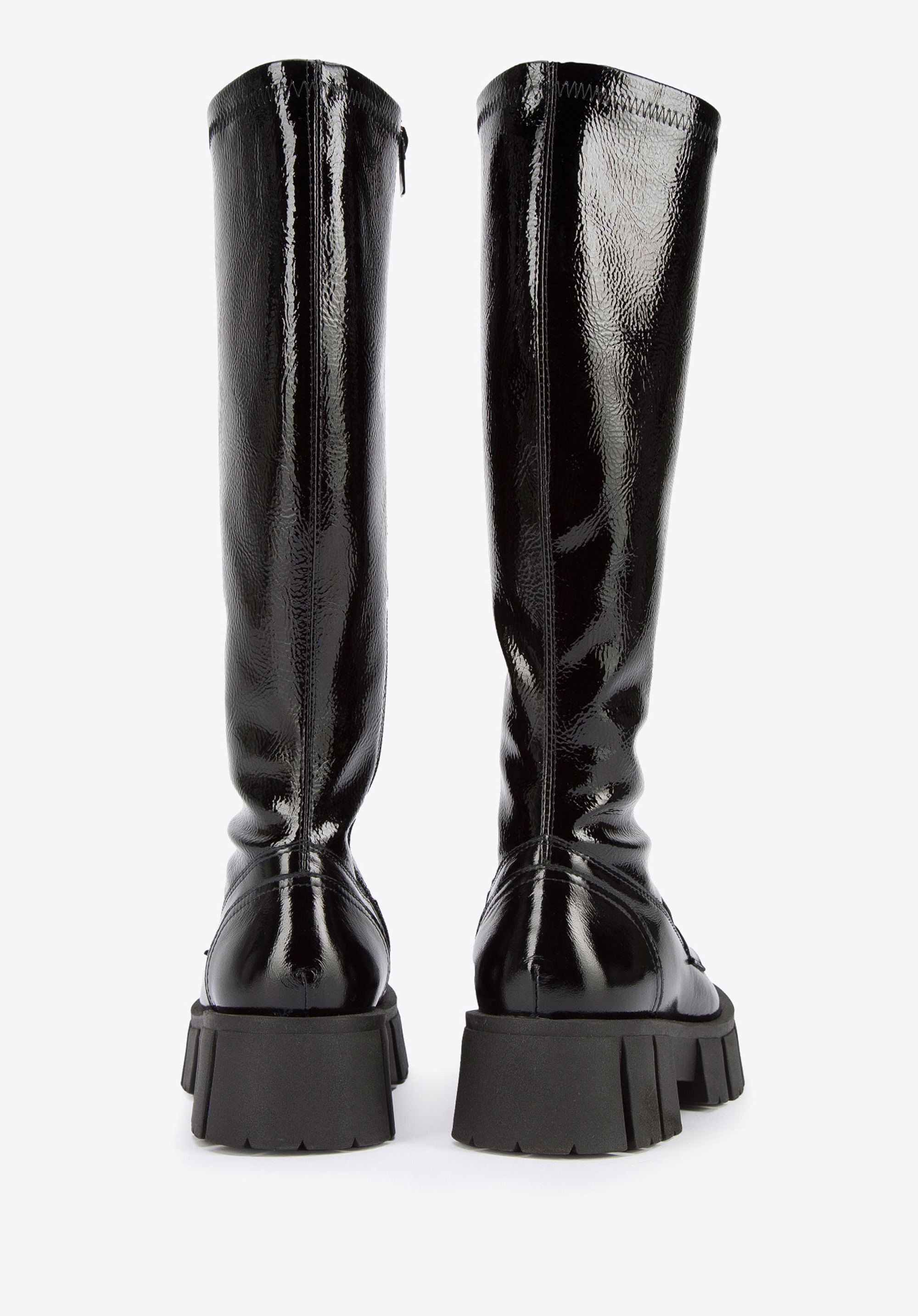 Diese einzigartigen Schuhe werden mehr als einen Blick auf sich ziehen. Sie sind in Polen aus hochwertigem Lackleder gefertigt. Die Vorderseite erinnert durch die gesäumte Schuhspitze und den Riemen an Mokassins. Sie haben den hohen Schaft und lassen sich aber dank des Reißverschlusses leicht anziehen. Außerdem isoliert die dicke Sohle gut gegen Kälte und bietet bei jedem Wetter die Haftung. Sie betonen das Bein perfekt mit einem Minirock oder einer maßgeschneiderten Hose. Die Stiefel à la Mokassins aus Lackleder sind ein Accessoire für jede Frau, die modische Accessoires mit Charakter mag.