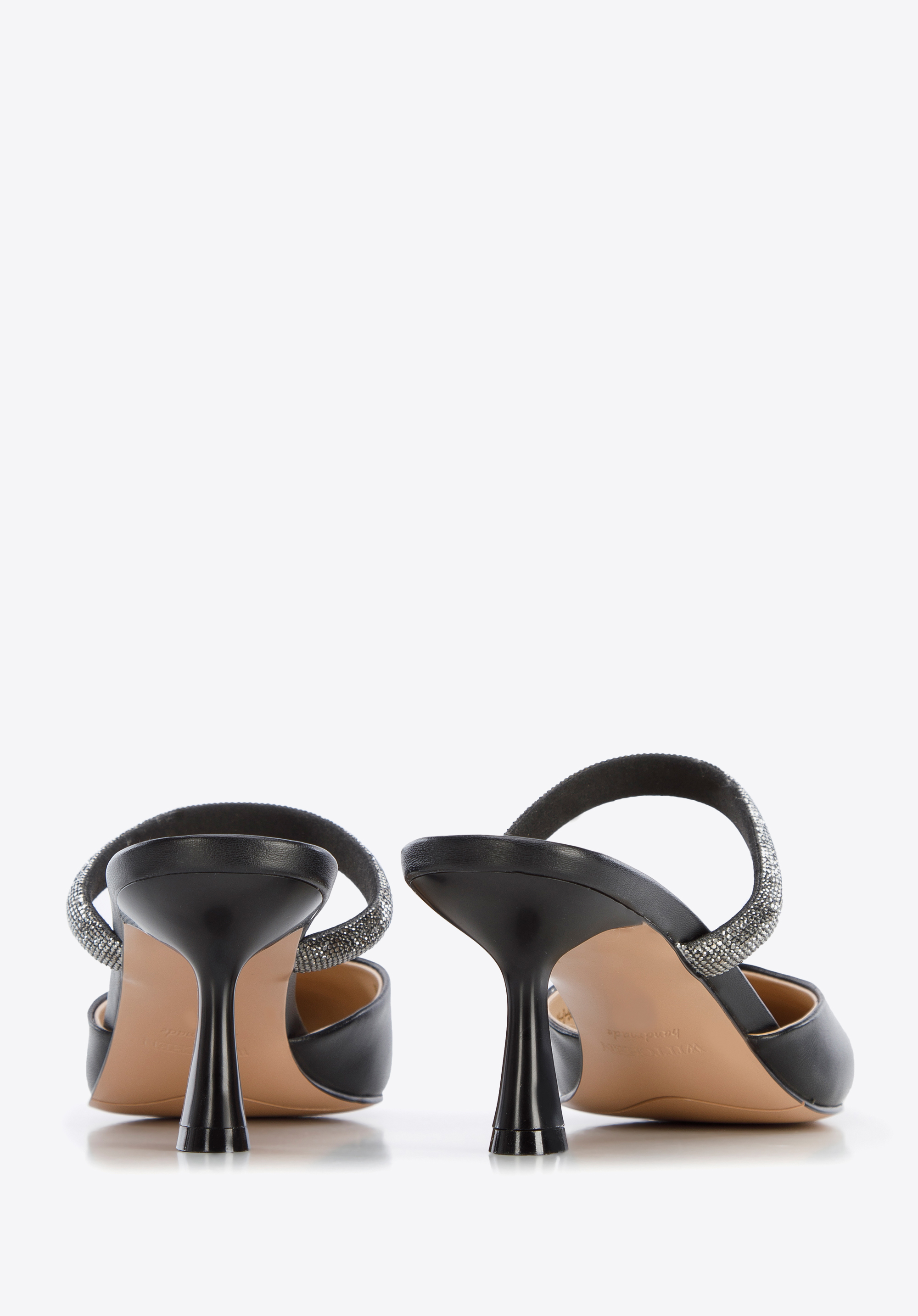 Diese eleganten Pantoletten werden alle Blicke auf sich ziehen. Sie sind aus hochwertigem Naturleder gefertigt. Der Riemen aus winzigen glänzenden Kristallen verleiht ihnen einen einzigartigen Charakter. Die spitze Schuhkappe macht Ihren Fuß schlanker, während der formschöne Stilettoabsatz gibt Ihnen ein paar Zentimeter Höhe. Tragen Sie sie sowohl zu Ihrem eleganten Lieblingskleid als auch zu einer Hose mit weitem Bein und einem Hemd. Die Stiletto-Pantoletten aus Leder sind eine gute Wahl für Liebhaber von Klassikern in der modernen Version.