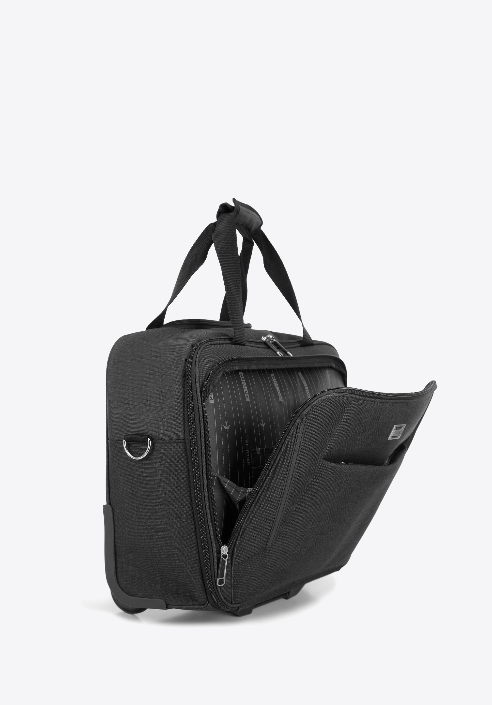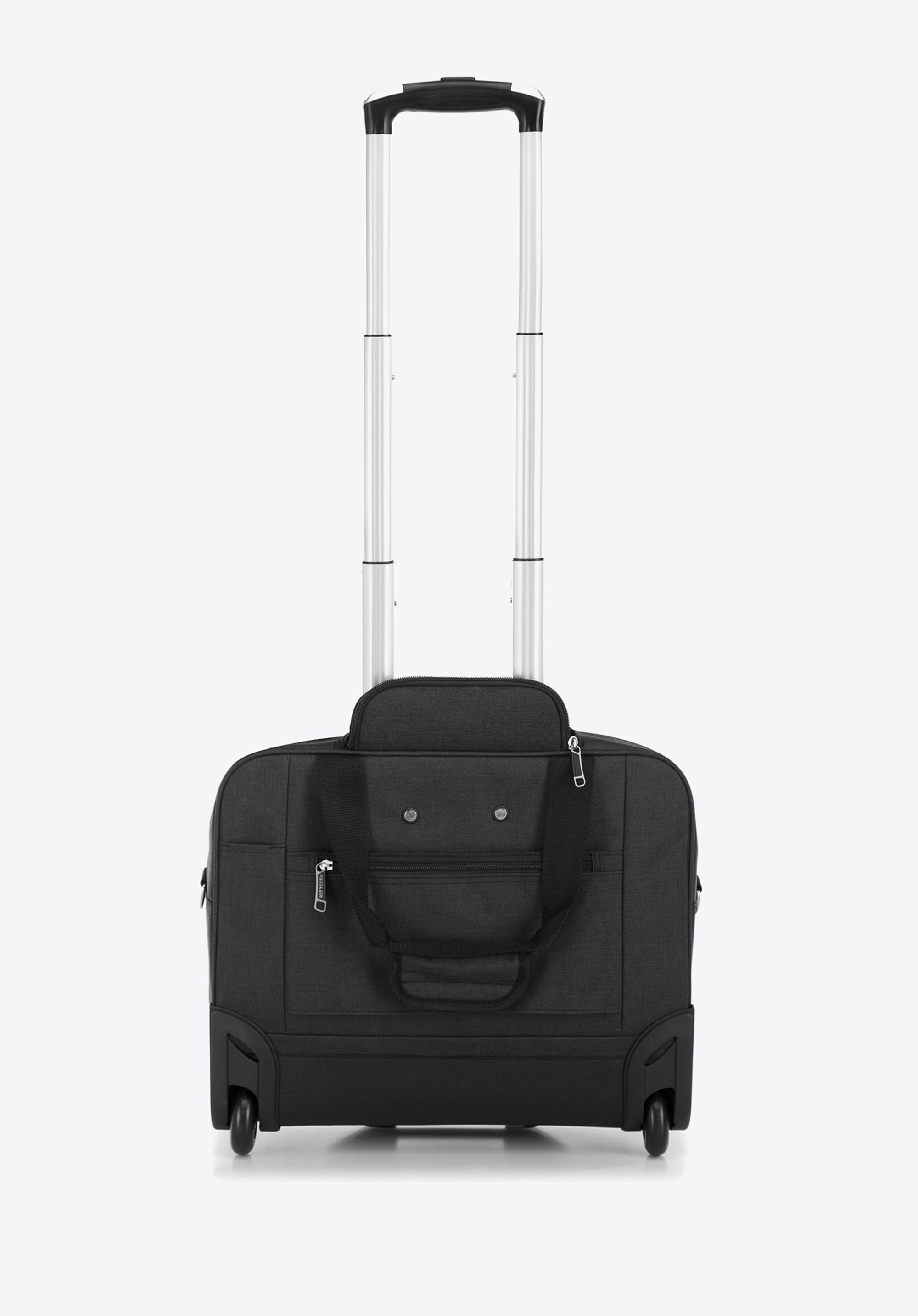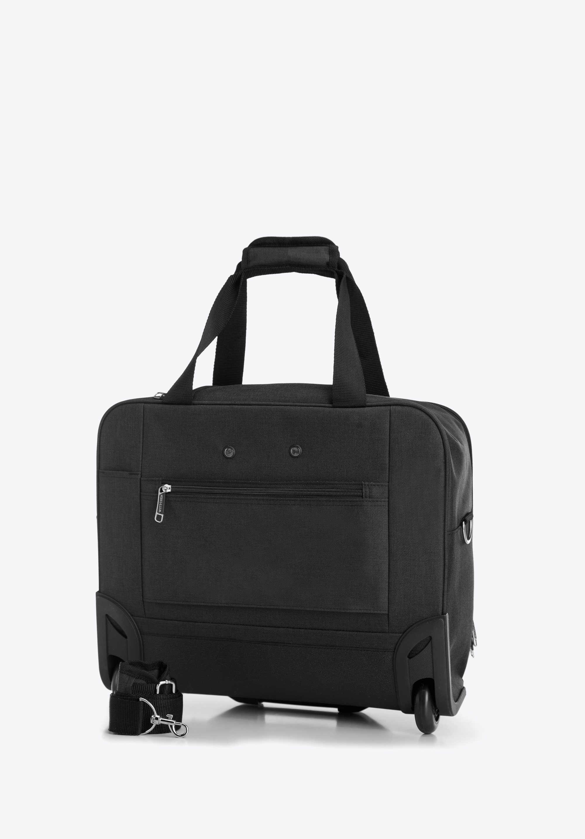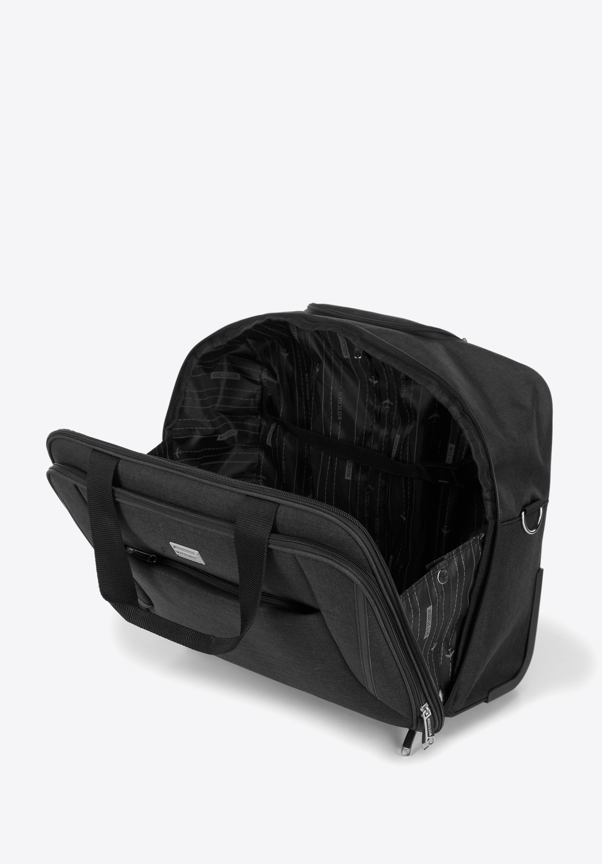Diese praktische und funktionelle Businesstasche dient sowohl als Laptoptasche als auch als Gepäck für einen kurzen Ausflug. Das Hauptfach verfügt über das weich gepolsterte Fach, das ein elektronisches Gerät mit maximalen Abmessungen aufnehmen kann: 31 cm x 39 cm. Die Innengurte minimieren die Bewegung der Sachen in der Businesstasche. Neben dem Reißverschluss befindet sich der Druckknopf- und Klettverschluss. Dieses Modell ist aus hochwertigem Polyester gefertigt und an der Unterseite mit Nieten verstärkt. Es hat zwei Rollen und den Teleskopgriff, damit es leicht zu tragen ist. Die Businesstasche mit Rollen ist für jeden gut organisierten Menschen sehr praktisch.