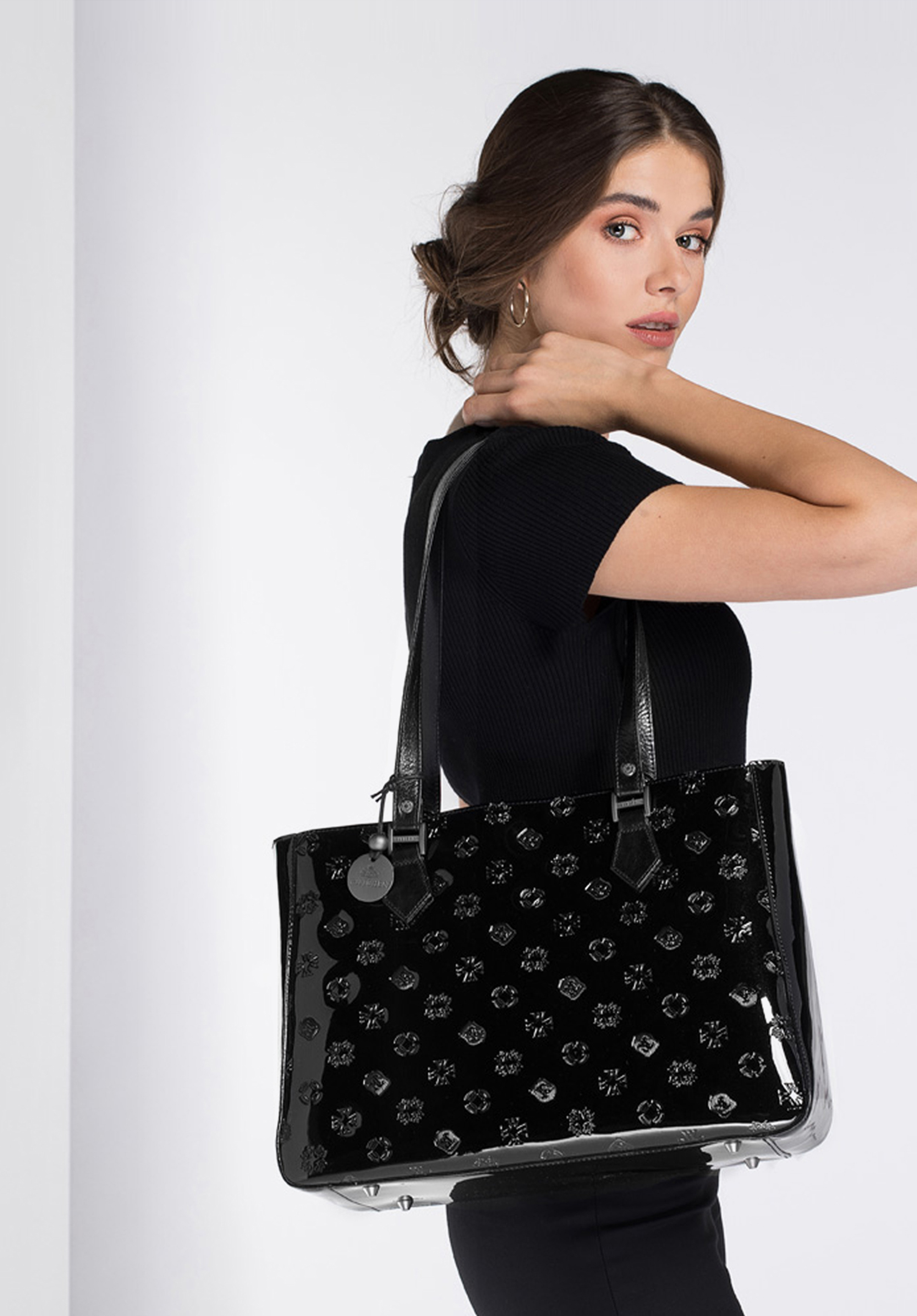 Diese elegante große Tasche ist ein einzigartiges Accessoire für jeden Tag. Sie wurde aus feinstem Leder hergestellt: Monogramm auf der Vorder- und Rückseite und glänzend an den Seiten. Im Inneren bietet sie viel Platz für Ihr Portemonnaie, A4-Dokumente, Kosmetika und viele andere Kleinigkeiten. Sie können sie zu Jeans, einem T-Shirt oder einem eleganten Kleid tragen und in jeder Situation stilvoll aussehen. Die Shopper-Tasche aus glänzendem Leder mit Monogramm ist eine gute Wahl für jede moderne Frau.