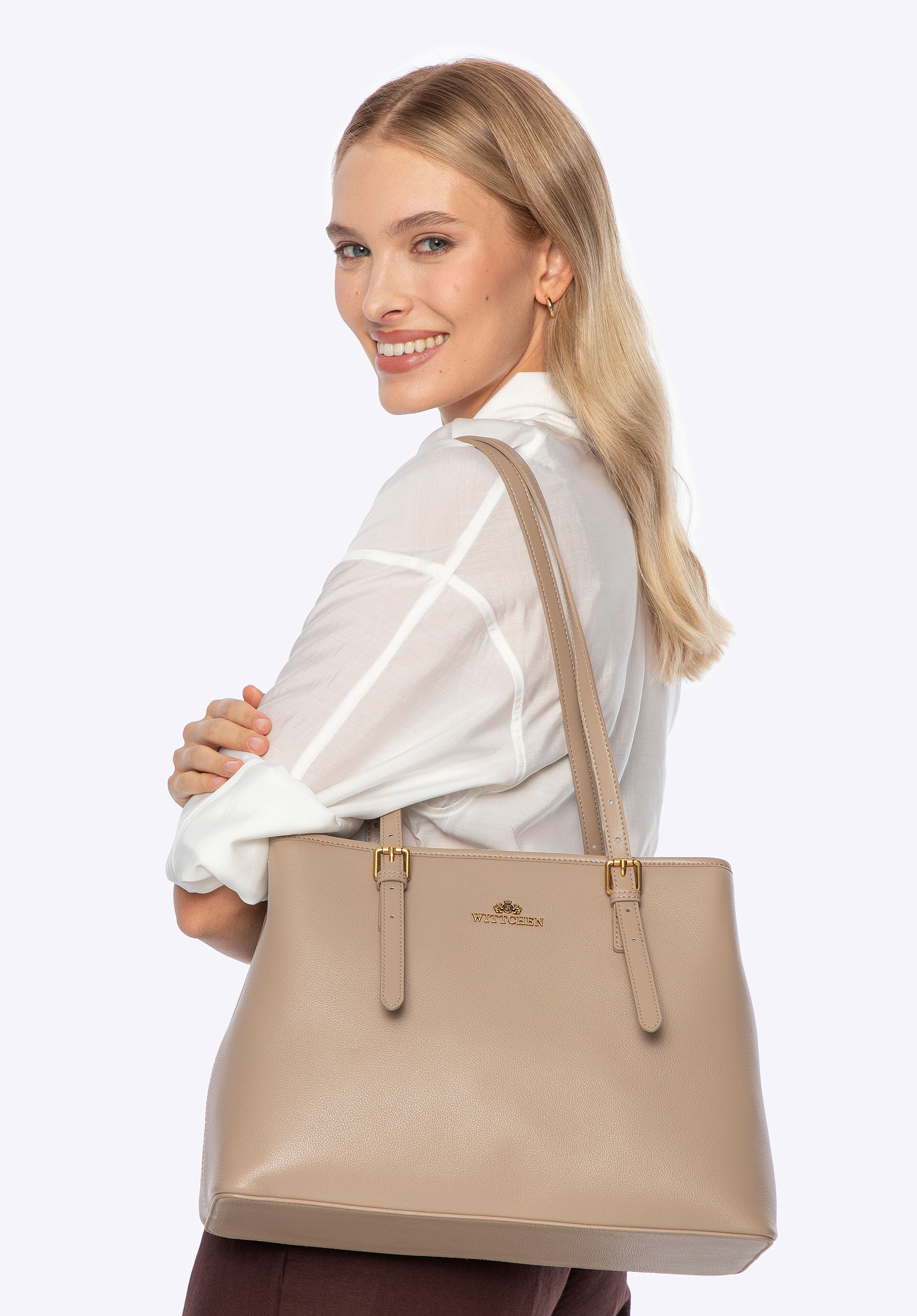 Unser Tipp: Kombinieren Sie die Shopper-Tasche mit einem schicken Midikleid und einem Ledergürtel in der Taille und komplettieren Sie den Look anschließend mit Stiefeletten mit Absatz und minimalistischem Schmuck – die Tasche verleiht Ihrem Outfit Harmonie und zeitlose Eleganz.