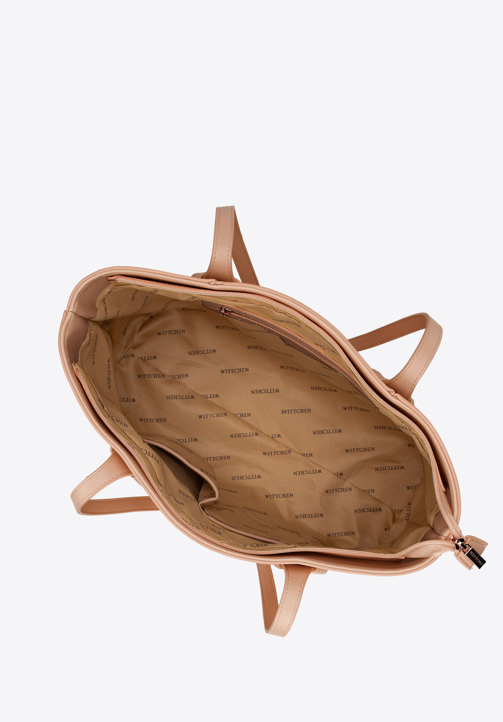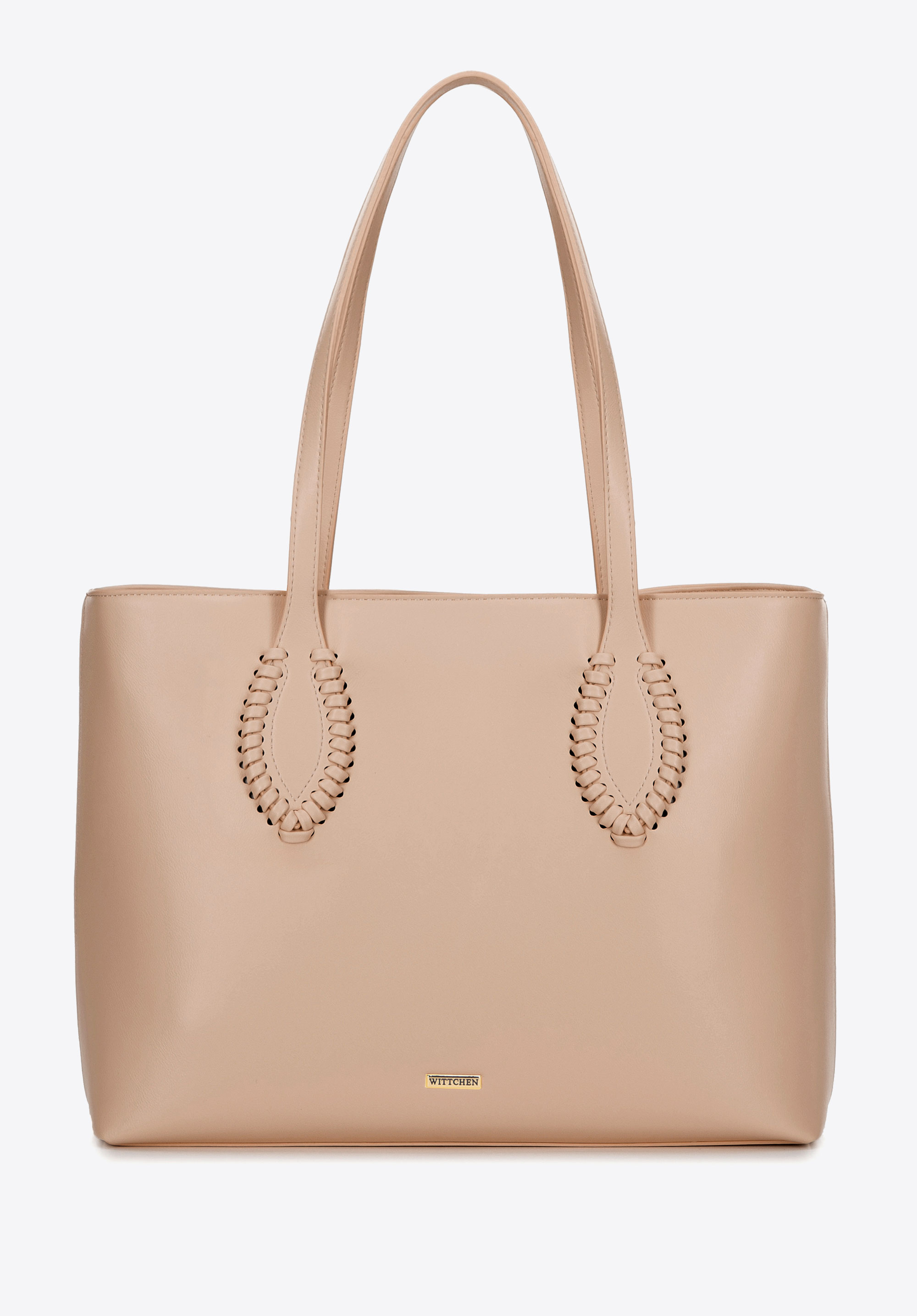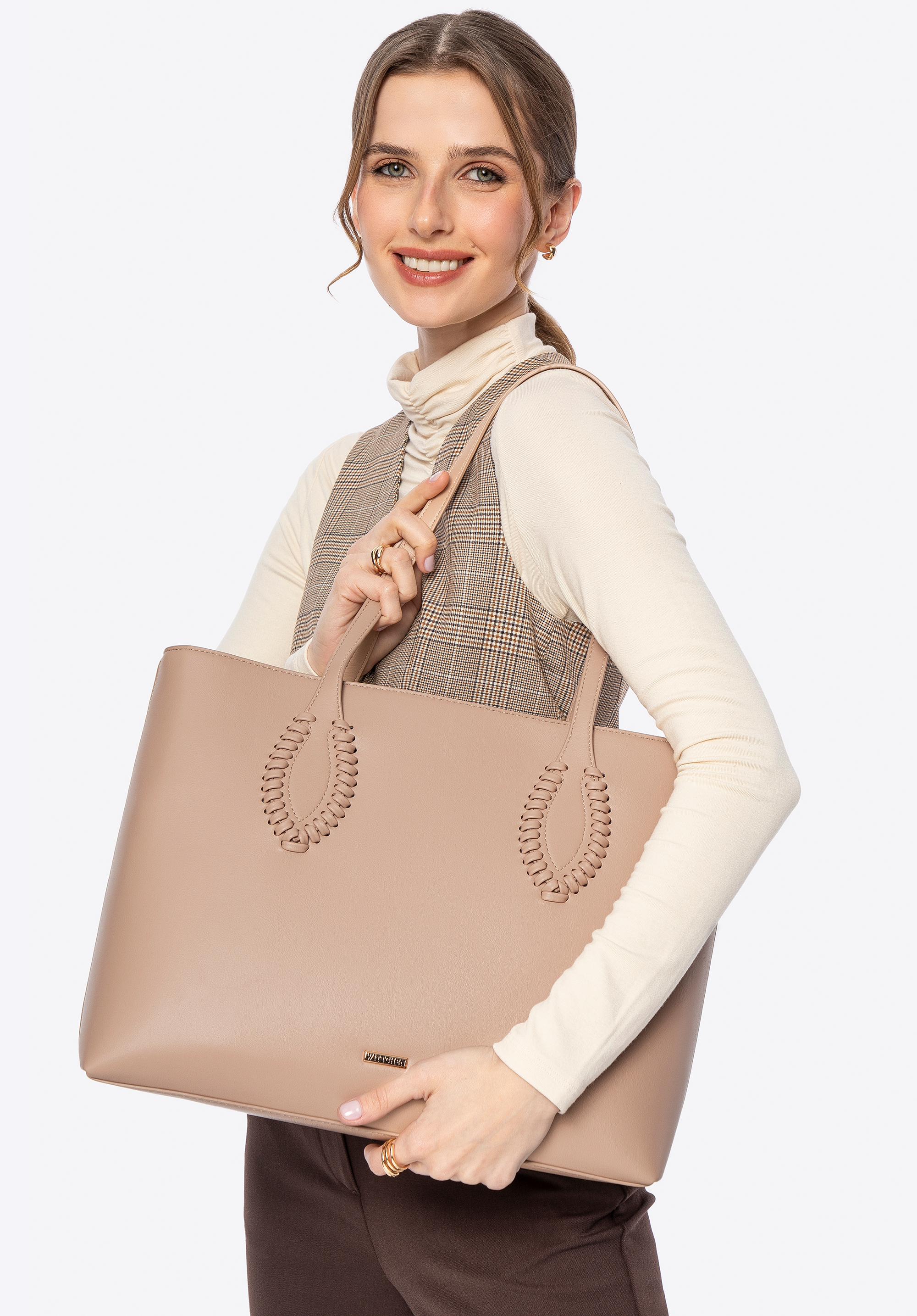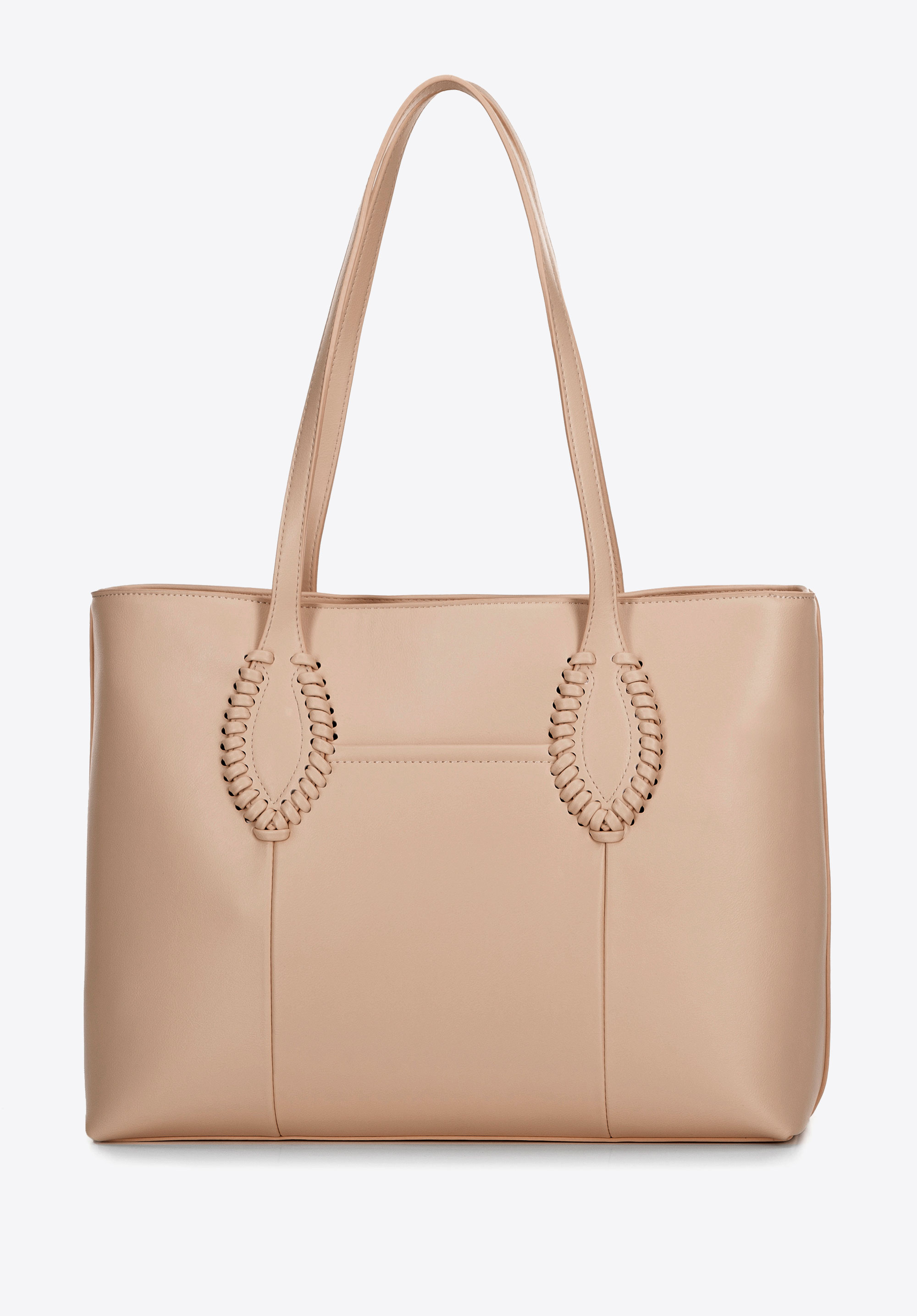 Stilvoll, geräumig und perfekt organisiert – diese Shopper-Tasche ist ein Must-have für Alltags-Outfits. Ihr klassisches Design, aufgewertet durch subtile Details, macht sie zur perfekten Ergänzung sowohl für elegante als auch für lässige Looks. Zwei bequeme Griffe ermöglichen ein bequemes Tragen über der Schulter, während das dekorative gewebte Detail an den Griffen eine einzigartige Note verleiht. Die Tasche ist mit einem Reißverschluss gesichert und im Inneren finden Sie drei praktische Taschen , darunter eine Tasche mit Reißverschluss. Eine zusätzliche offene Tasche auf der Rückseite ist perfekt für Ihre wichtigsten Dinge.