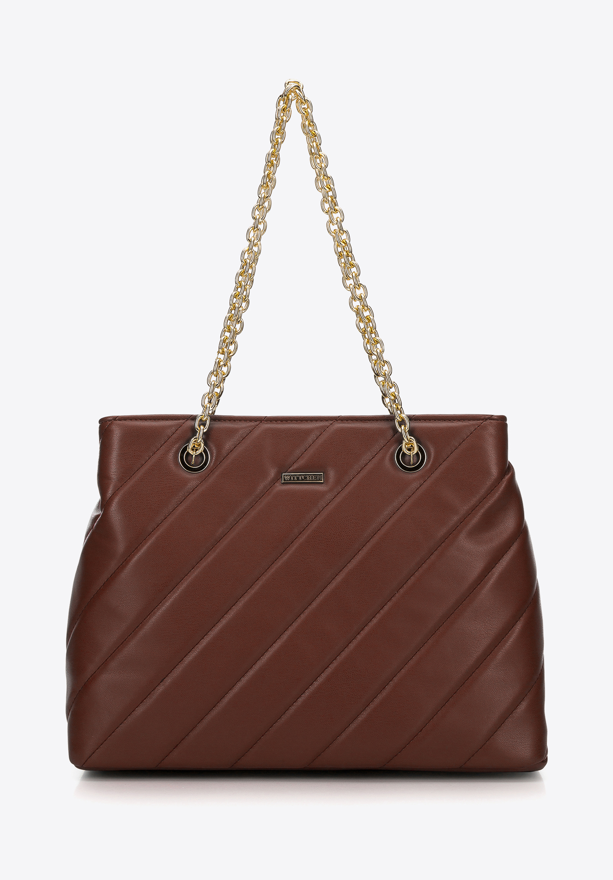 Diese Damen-Shopper-Tasche eignet sich hervorragend für die stilvolle Alltagsausstattung . Diese Handtasche ist aus hochwertigem Kunstleder mit schräger Steppung für zusätzlichen Reiz gefertigt. Dieses Accessoire verfügt über einen Kettenschulterriemen . In dieser großen Shopper-Tasche können Sie alle Dinge des täglichen Bedarfs problemlos verstauen und gut organisiert aufbewahren. Ein Reißverschluss hält alles sicher und macht diese Handtasche zum perfekten Partner für einen Tagesausflug. Diese Shopper-Tasche aus Kunstleder mit Kettenschulterriemen passt gut zu jedem Outfit, einschließlich farblich abgestimmtem Kleid oder Chinos und Hemd.