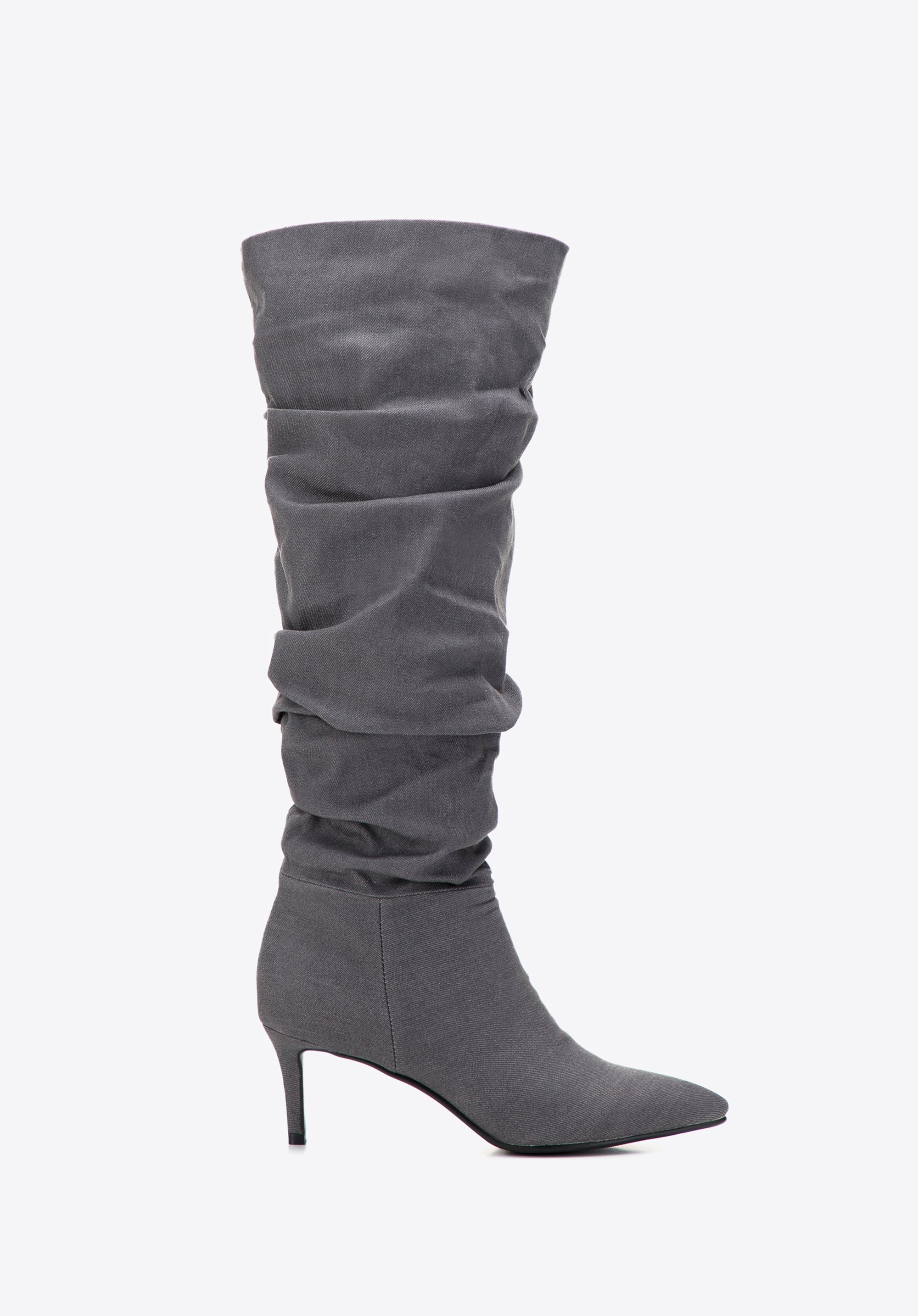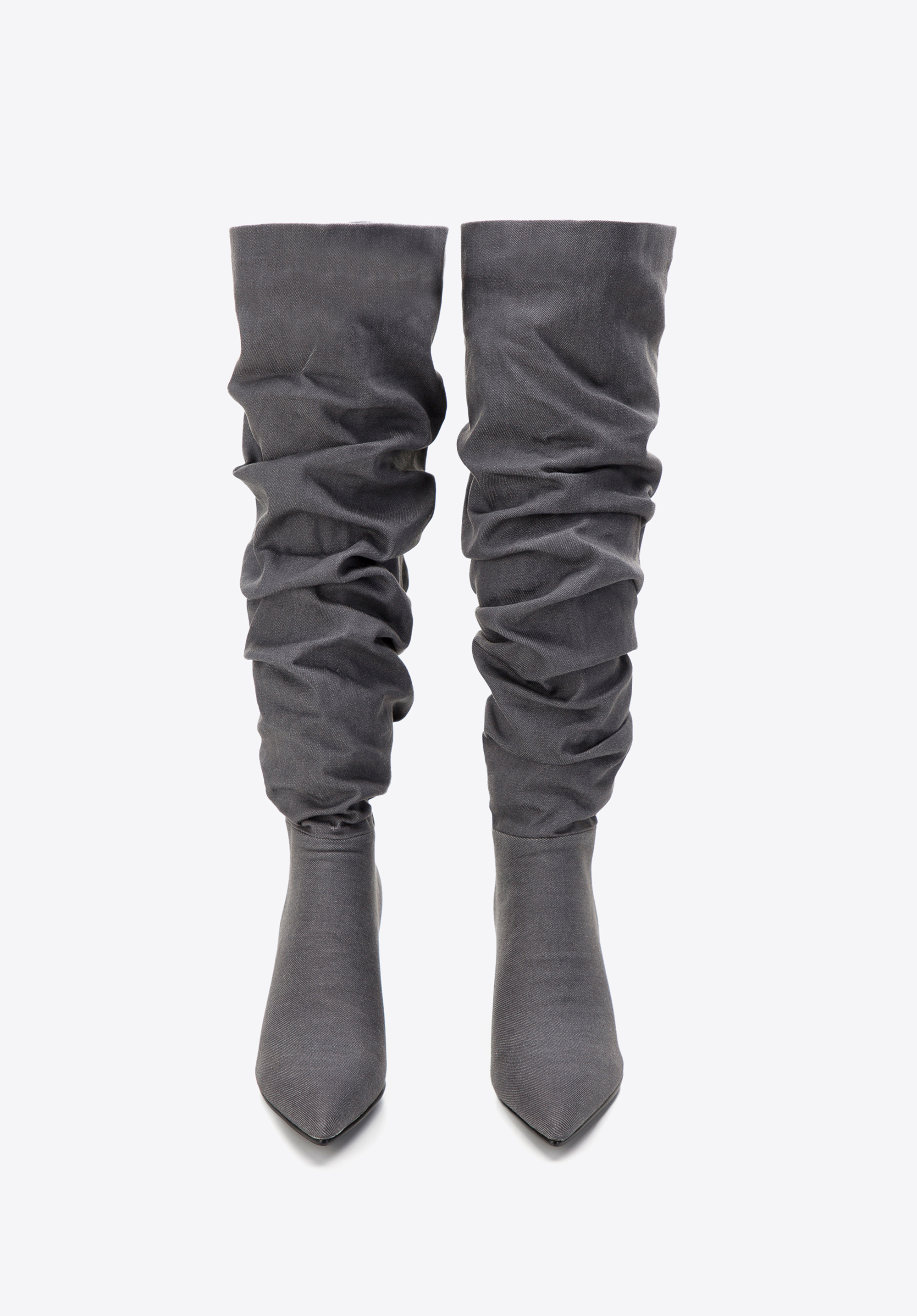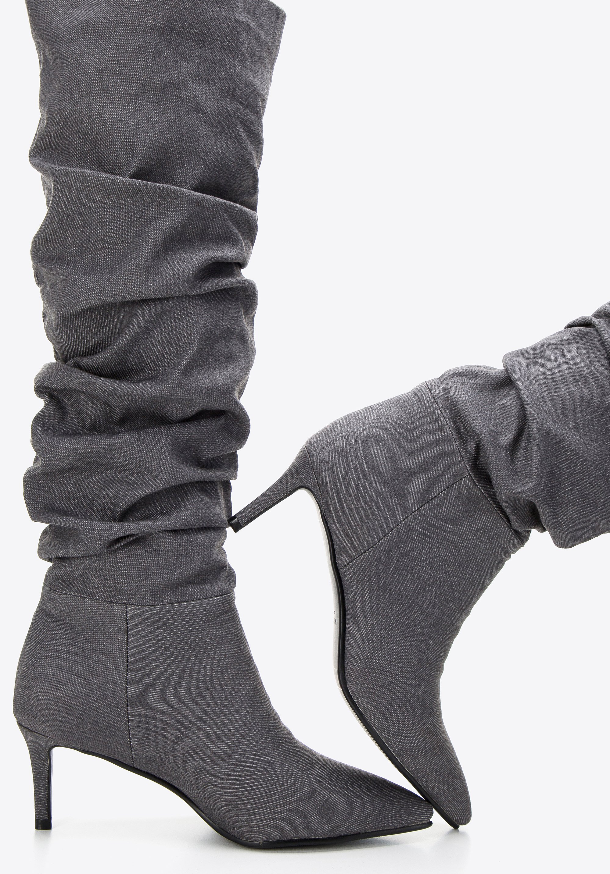 Faszinierend, überraschend und auf den ersten Blick auffallend - das sind unsere Damenstiefel mit Jeans-Absatz. Ein Modell, das jedem Outfit Charakter verleihen wird. Wenn Sie originelle Schuhe mögen, werden Sie nicht an ihnen vorbeigehen können. Sie sind aus Baumwollstoff (Denim) gefertigt, der am Bein gut aussieht. Innen sind sie mit einem weichen, fleeceähnlichen Futter ausgestattet, das für zusätzlichen Komfort sorgt und es ermöglicht, den ganzen Tag in ihnen zu laufen. Und das trotz des Absatzes! Das gewellte Obermaterial macht es leicht, die Schuhe anzuziehen. Außerdem kann man es je nach Bedarf verstellen und so kleinere oder größere Falten erzeugen. Die spitze Schuhspitze verleiht der gesamten Silhouette einen Hauch von Leichtigkeit und ist zudem äußerst modisch. Alles in allem ein äußerst femininer Schuh, von dem Sie sich nicht trennen wollen!