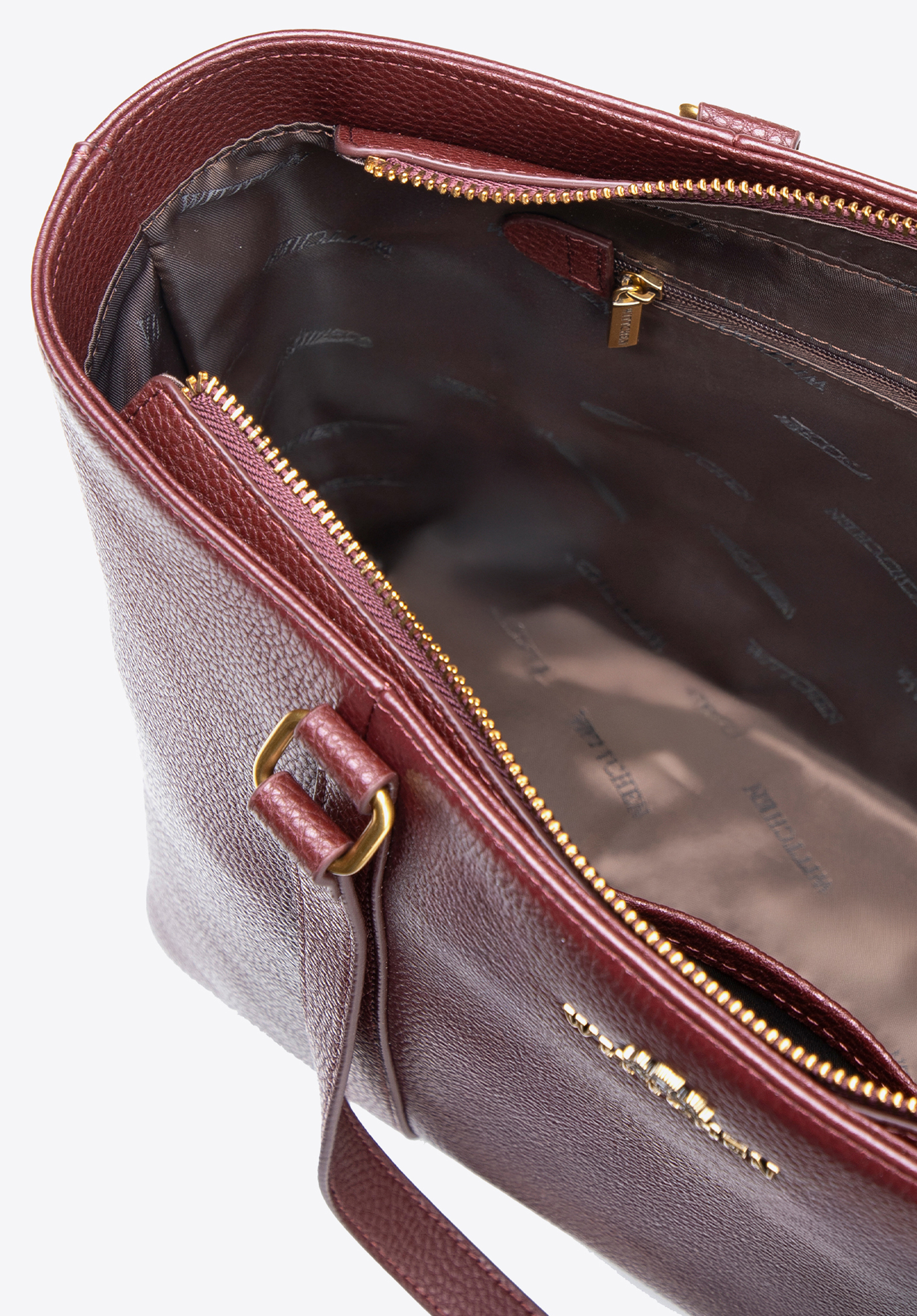Diese Shopper-Tasche wurde speziell für Ihre täglichen Bedürfnisse entworfen und vereint Eleganz, Qualität und Komfort. Das Obermaterial aus naturbelassenem Leder mit genarbter Oberfläche sorgt für ein stilvolles Finish und lange Haltbarkeit, während die Innenseiten der Griffe und die Innenausstattung aus Kunstleder ein leichtes und angenehmes Tragegefühl garantieren. Ihr klassisches Design passt mühelos zu vielen Outfits – vom Business-Look bis zum lässigen Wochenend-Style. Der Reißverschluss hält Ihre Wertsachen sicher, und im Inneren befinden sich zwei praktische Fächer, eines davon mit Reißverschluss, sodass Sie Ihr Handy, Ihre Schlüssel und Dokumente stets griffbereit haben.