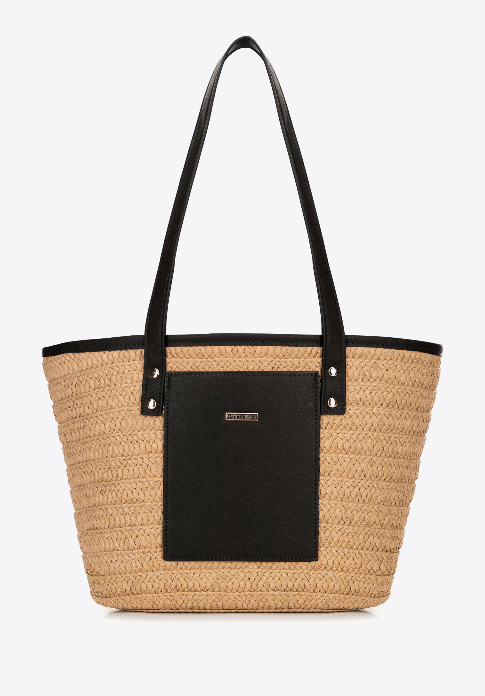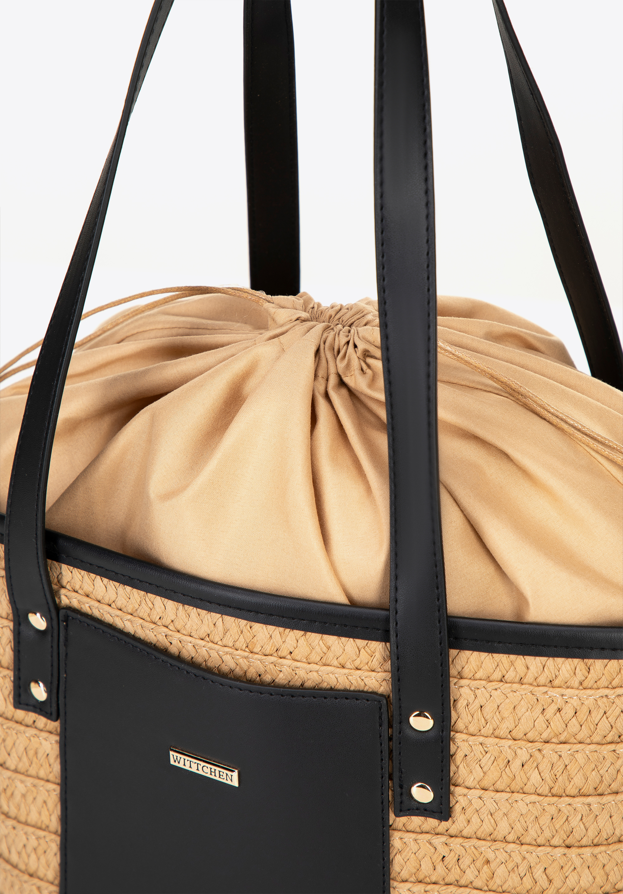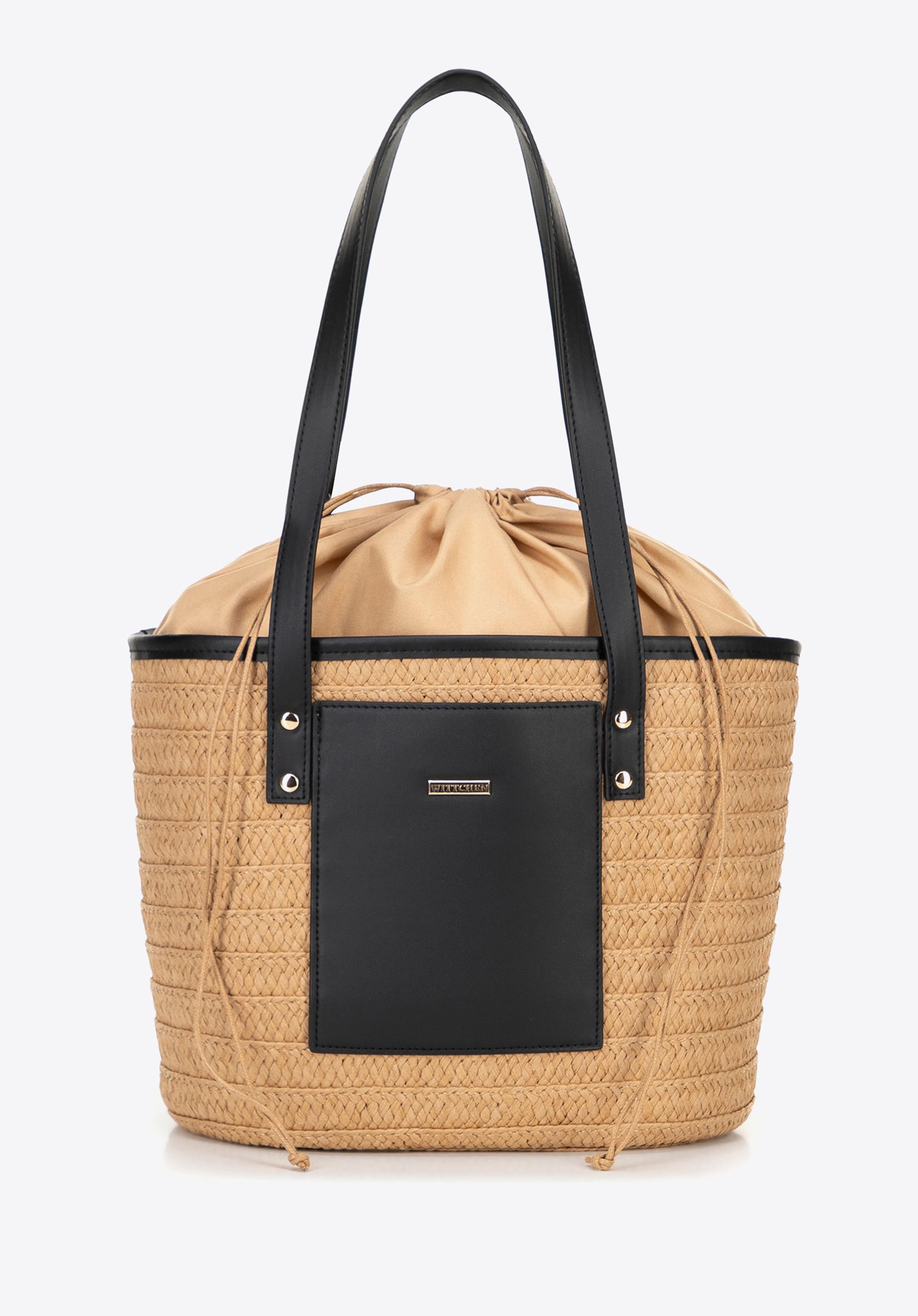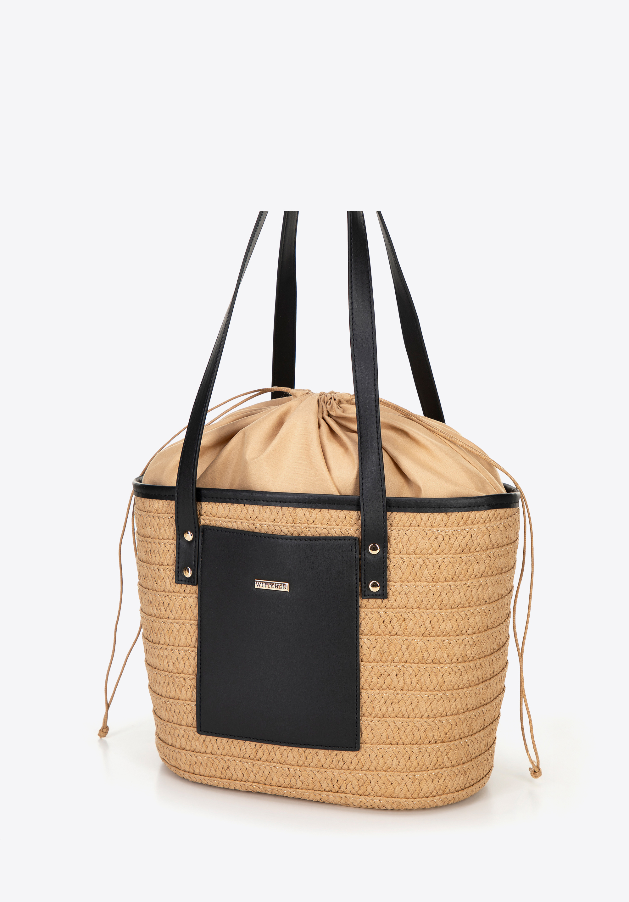 Unsere Damenhandtasche im Korbdesign ist aus Papierstroh gefertigt und besticht durch eine wunderschöne natürliche Flechtung und dezente Details. Die Vorderseite ziert ein kleines Fach für wichtige Utensilien und ein Marken-Kunstleder-Patch verleiht ihr einen Hauch von Eleganz. Das Innere ist mit Polyester gefüttert und lässt sich mit Kordelzug leicht verschließen – eine praktische Lösung, um Ihre Wertsachen sicher aufzubewahren.