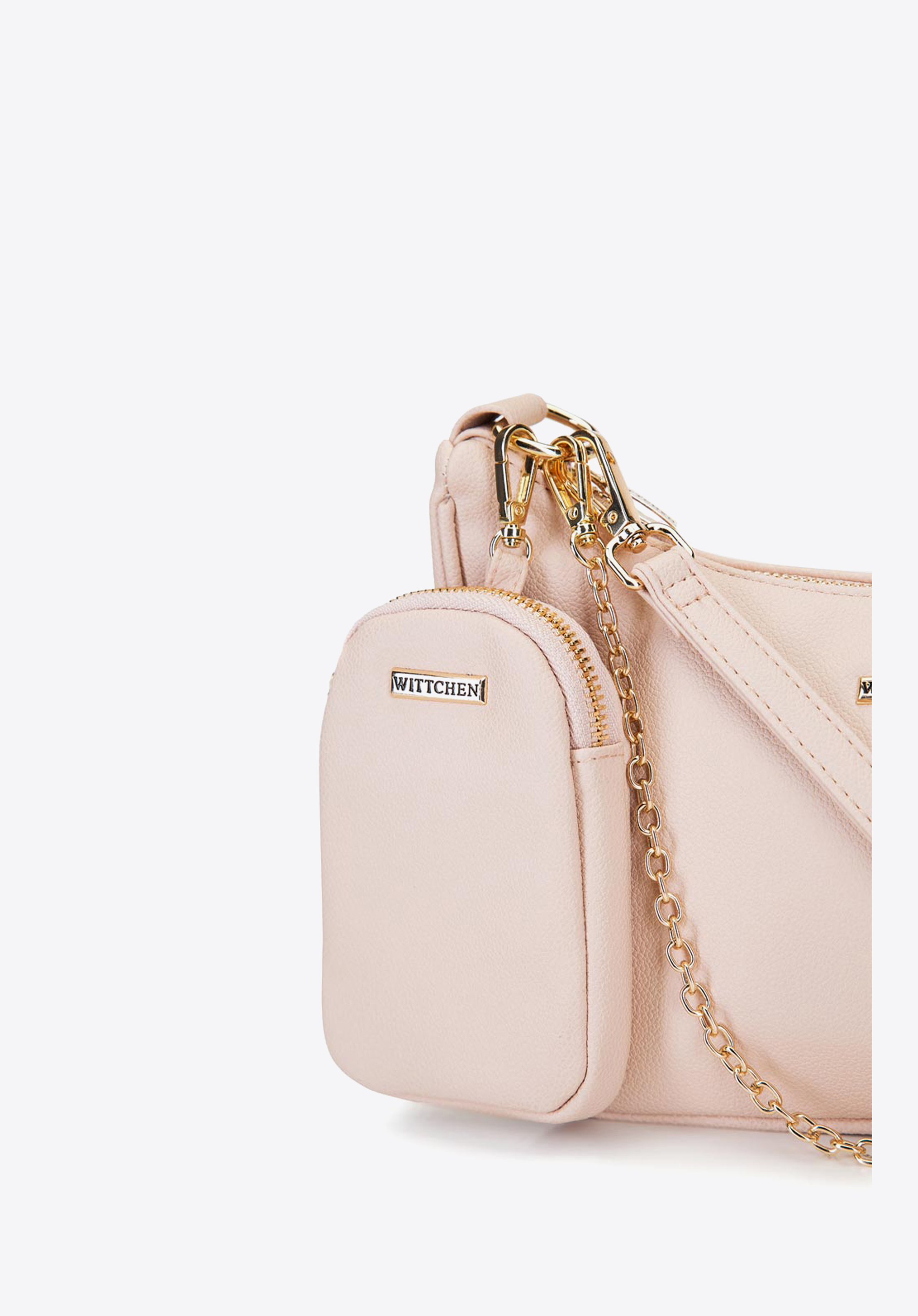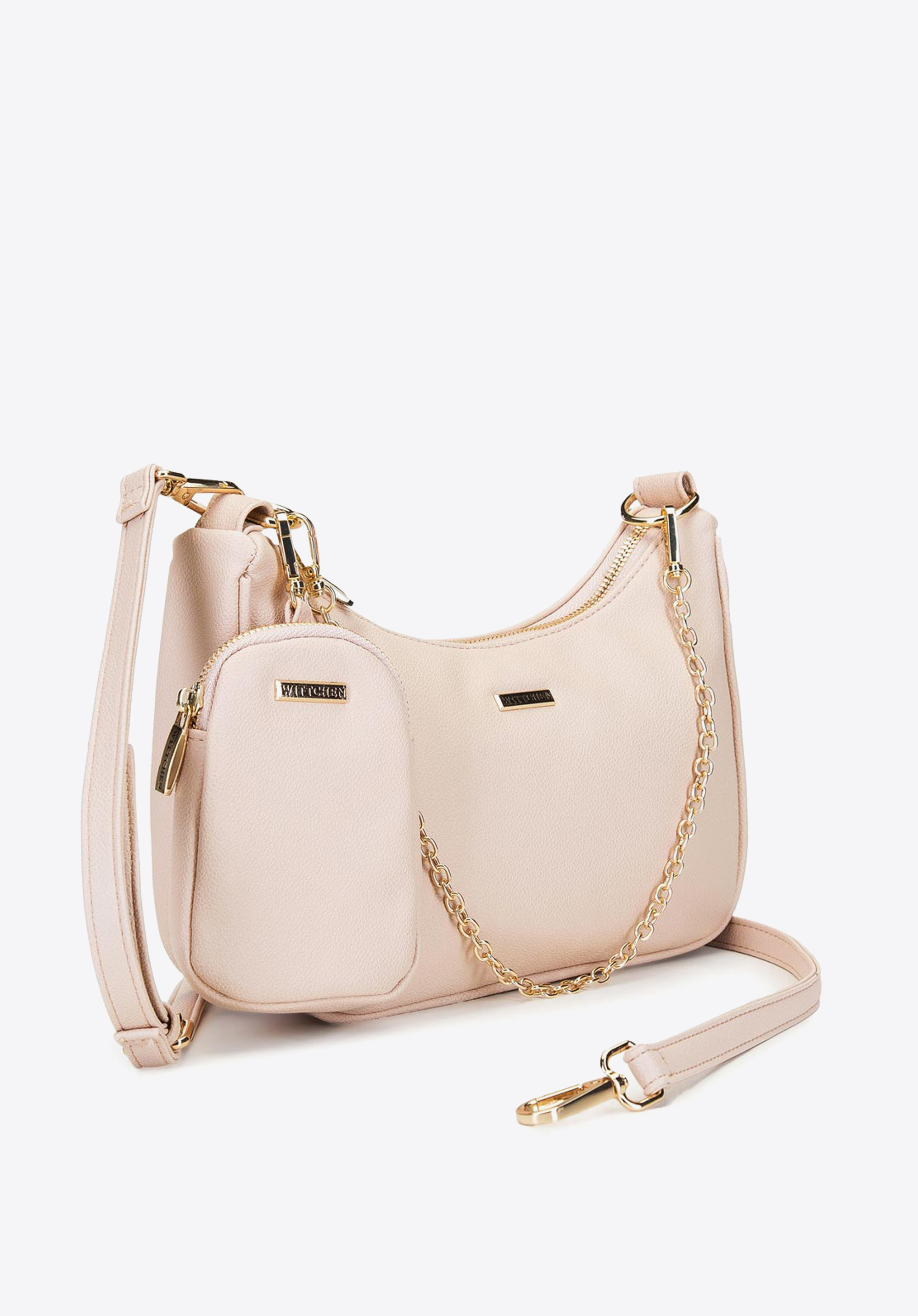 Eine eher kleine, aber sehr auffällige Crossbody-Tasche, die jedem Outfit einen schicken Touch verleiht. Sie ist aus weichem und angenehm zu berührendem Ökoleder gefertigt. Der hornförmige Schnitt wird durch einen aufsteckbaren Beutel und eine Kette ergänzt - Details, die die Blicke auf sich ziehen werden. Im Inneren verfügt die Tasche über zwei Fächer, eines davon mit Reißverschluss. Die Tasche ist mit zwei Fächern ausgestattet, von denen eines mit einem Reißverschluss versehen ist, so dass Sie Ihre wichtigsten Utensilien darin verstauen können: Make-up, Wasserflasche und Handy. Die Tasche kann auch abgetrennt und separat verwendet werden. Sie ist der Inbegriff femininer Eleganz und passt perfekt zu einem luftigen Kleid oder einem Chiffonrock.