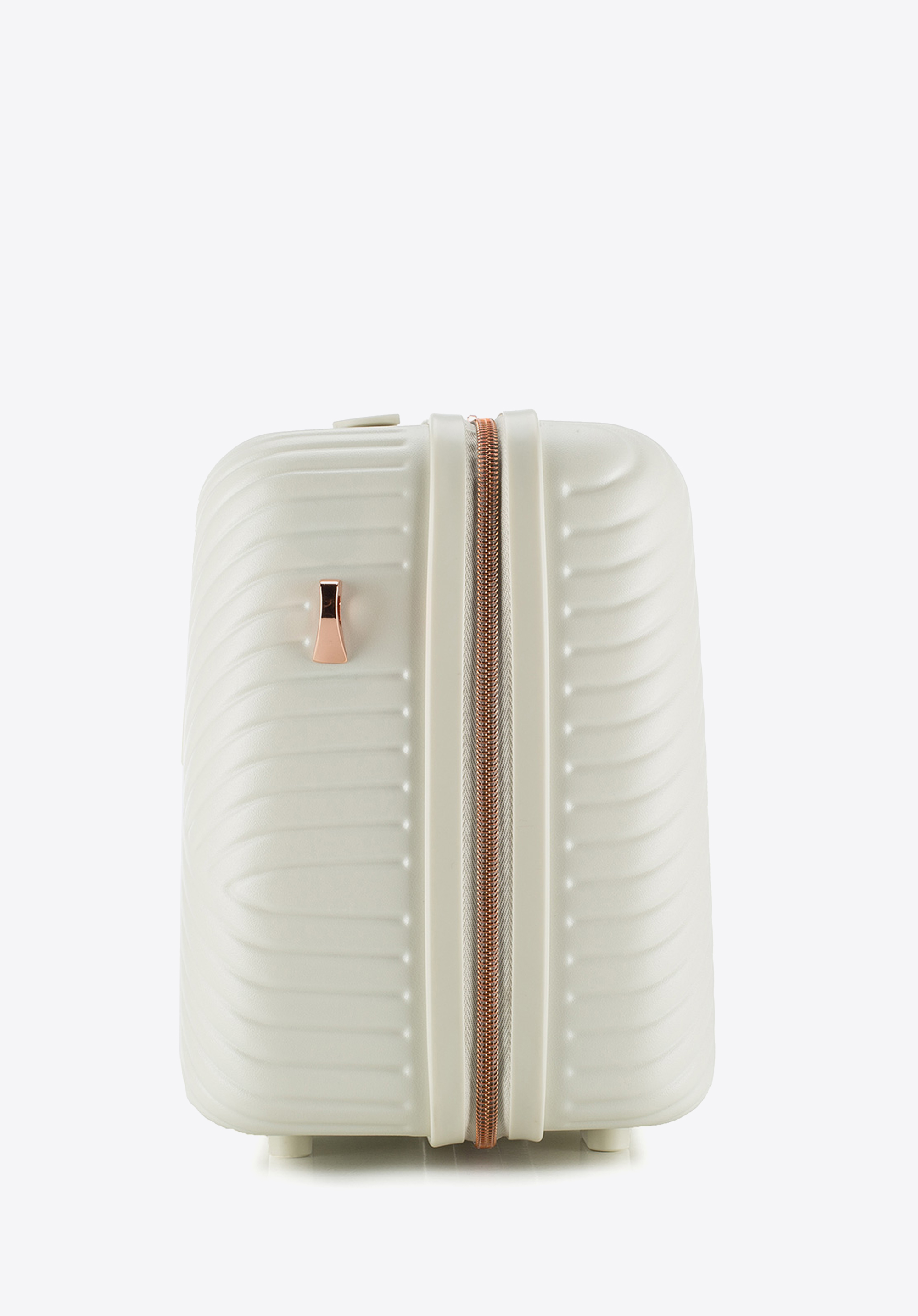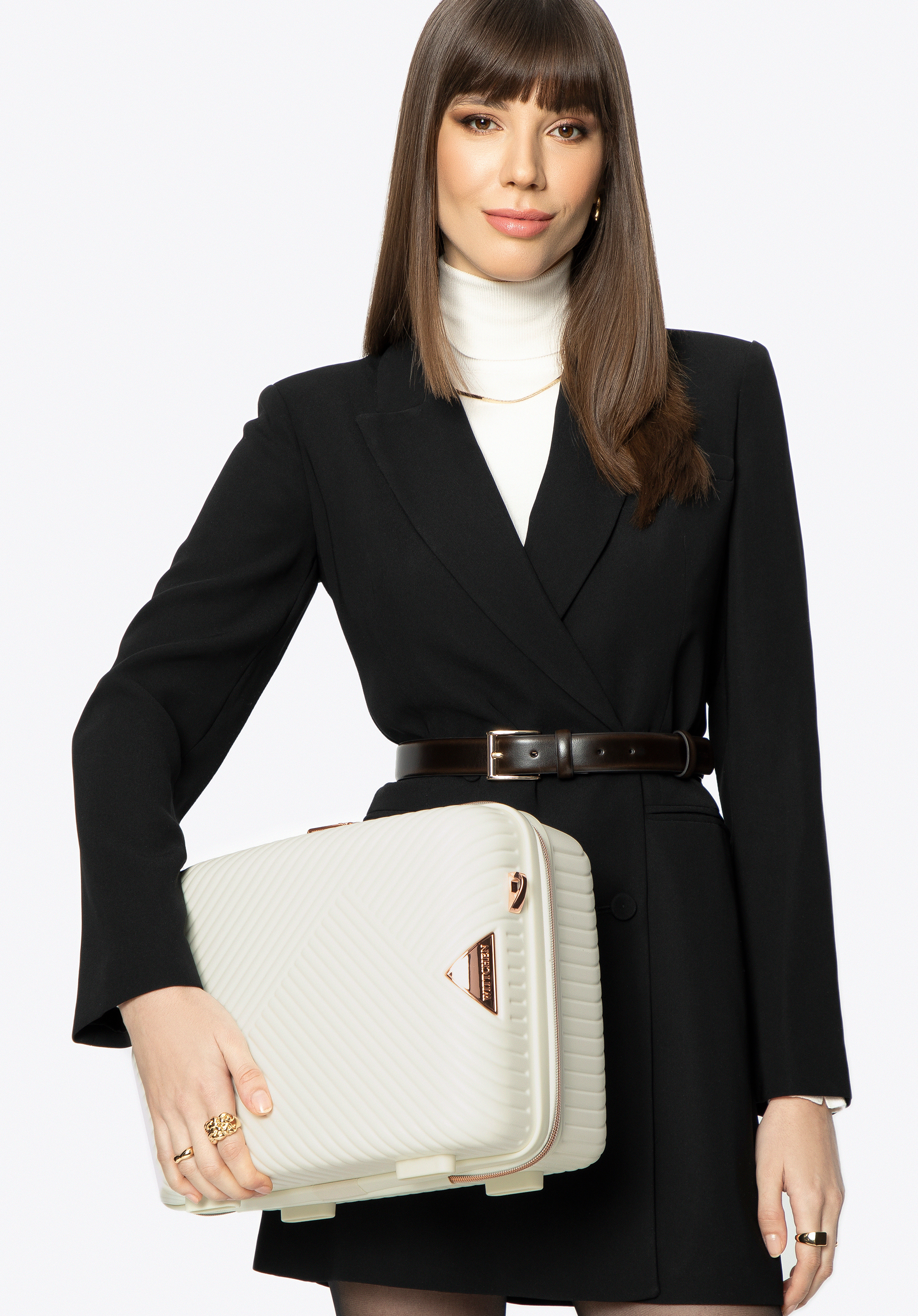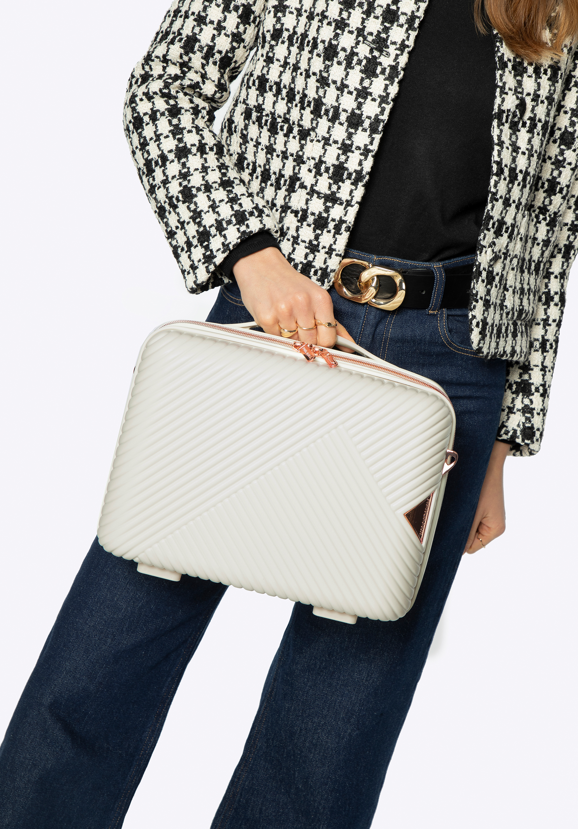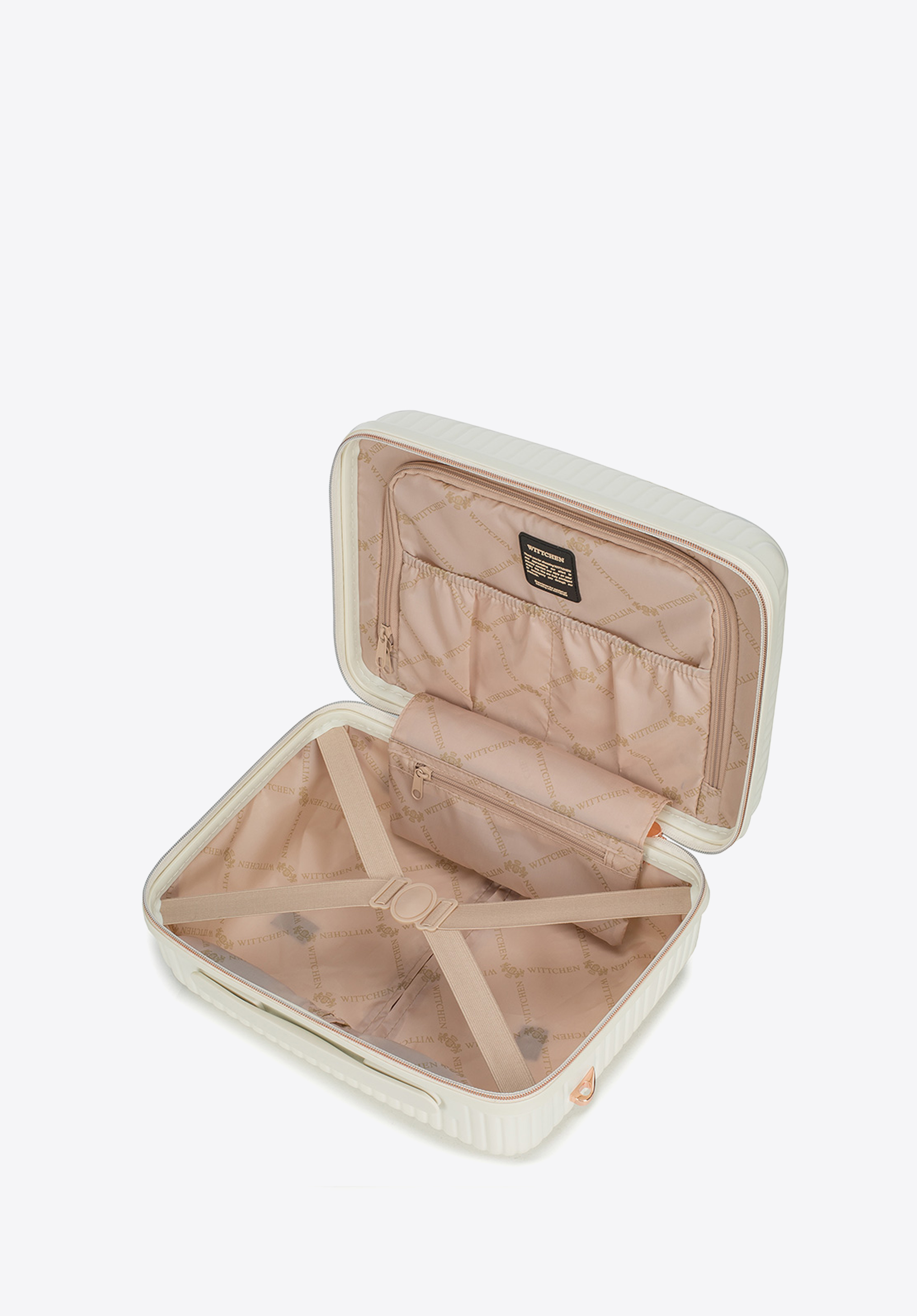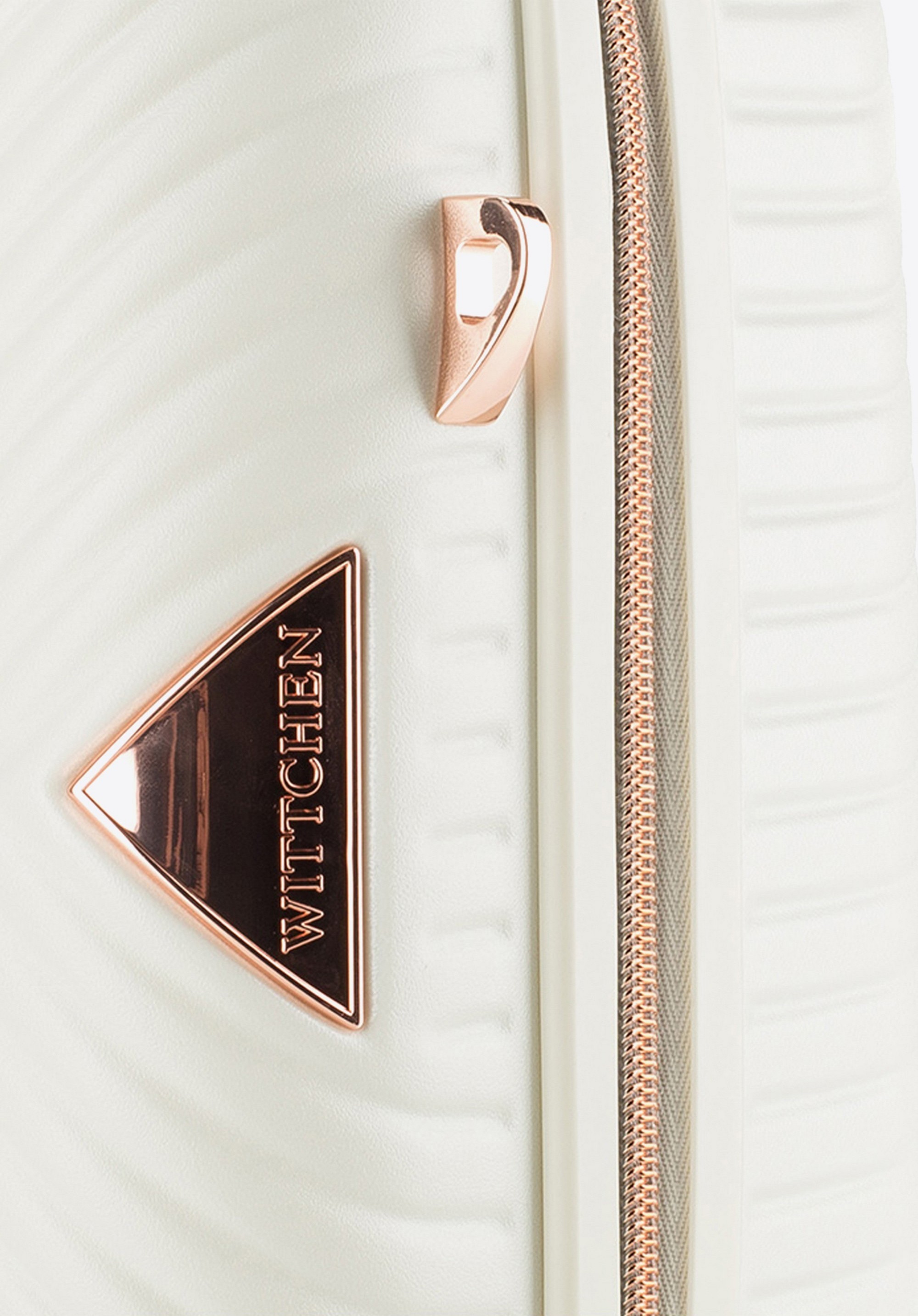 Der leichte Kosmetikkoffer wird aus Polycarbonat mit matter Oberfläche hergestellt. Das elegante Beauty Case wir mit glänzenden Elementen in Roségold geschmückt. Der Innenraum wird mit beigefarbenem Futter mit WITTCHEN-Logo bedeckt. Dieses Modell ist in drei Farbtönen erhältlich: Weiß, Schwarz und Rosa.