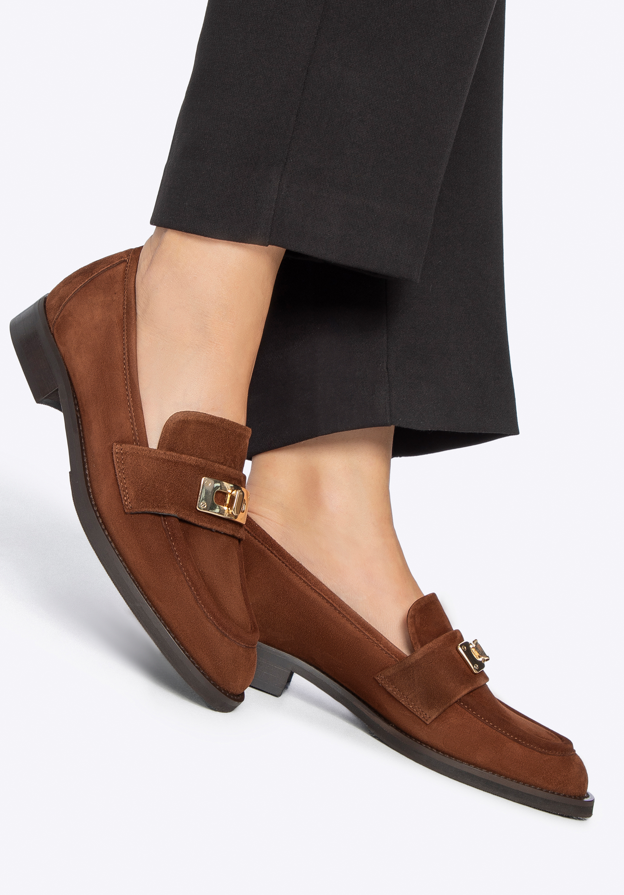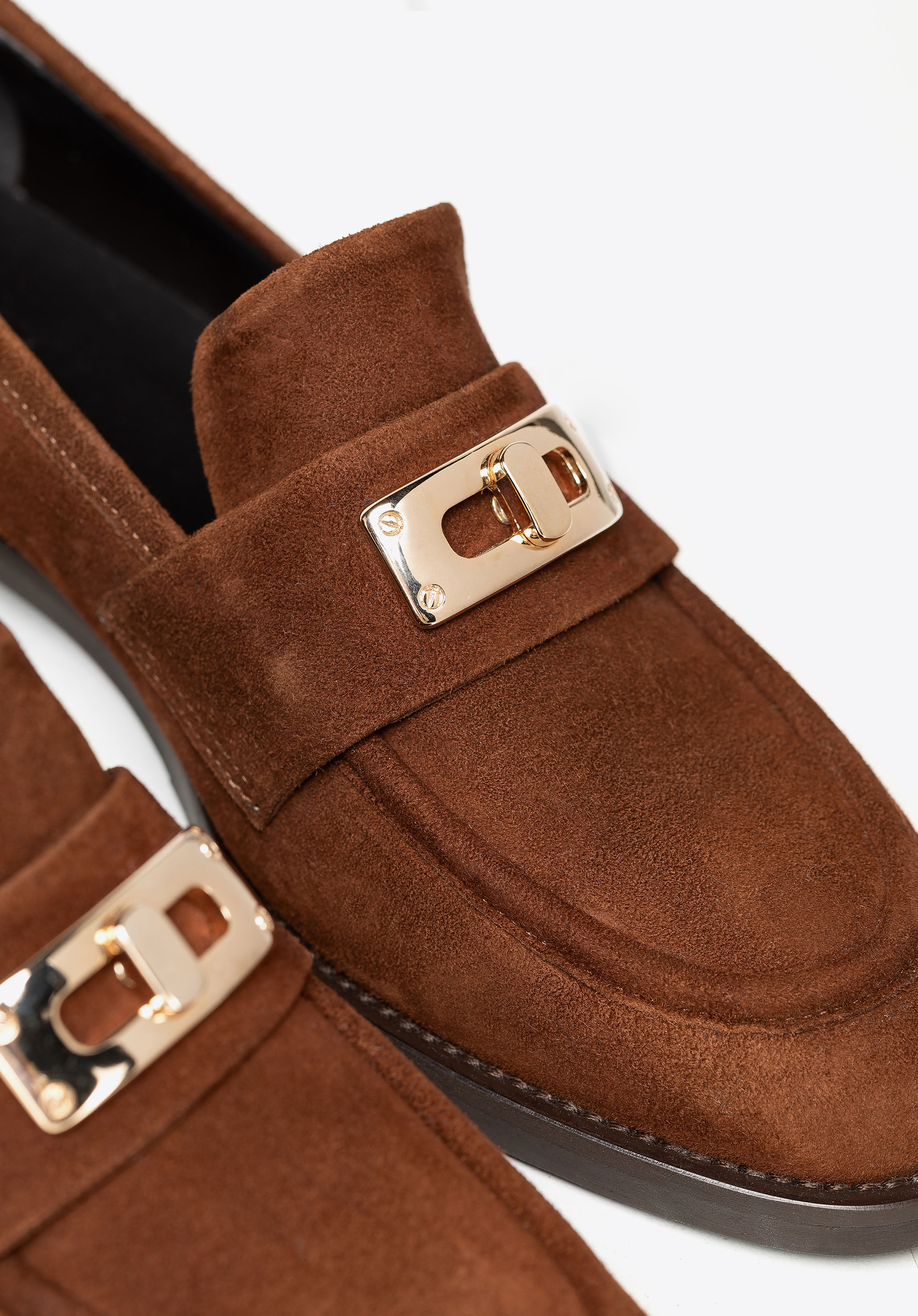Werten Sie Ihre Garderobe mit diesen Loafern auf, die klassische Eleganz mit Alltagskomfort perfekt verbinden. Gefertigt aus weichem, natürlichem Wildleder , bestechen sie durch ihre stilvolle Silhouette und ihre luxuriöse Textur, die jedem Outfit einen Hauch von edlem Charme verleiht. Die mandelförmige Zehenpartie streckt den Fuß sanft und sorgt für einen schmeichelhaften Look, während das dekorative Element an der Vorderseite einen schmuckinspirierten Akzent setzt. Gefüttert mit weichem Naturleder sorgen sowohl die Innensohle als auch das Futter für Komfort, Atmungsaktivität und eine perfekte Passform.